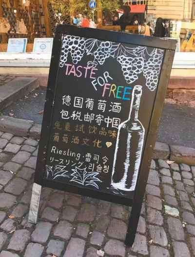 德國法蘭克福,當(dāng)?shù)仄咸丫粕掏瞥隽酥形膹V告牌。記者 李強攝