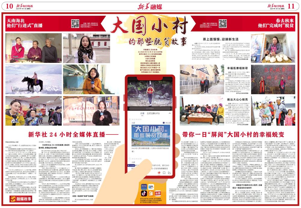 2020年12月31日0點(diǎn)0分0秒起,新華社26個(gè)國(guó)內(nèi)分社聯(lián)動(dòng),開(kāi)啟24小時(shí)全媒體直播《大國(guó)小村的那些脫貧故事》。從白雪皚皚、零下40多攝氏度的黑龍江,到椰風(fēng)習(xí)習(xí)、零上10多攝氏度的海南,從海拔超4000米的高原,到廣袤的平原,從數(shù)十萬(wàn)米之遙的衛(wèi)星視角,到纖毫畢現(xiàn)的特寫(xiě)鏡頭……100余名新華社記者走進(jìn)散落于960萬(wàn)平方公里土地上的小村,用鏡頭、用對(duì)話、用老鄉(xiāng)的皺紋與笑容,講述一個(gè)個(gè)鮮活的脫貧故事,繪就決戰(zhàn)脫貧攻堅(jiān)的恢宏畫(huà)卷。