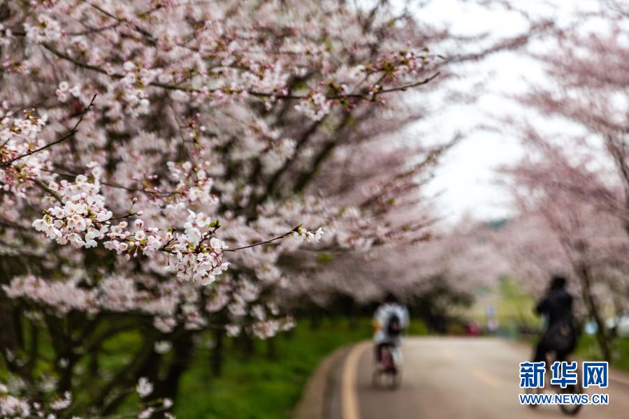 春季里,貴州省貴安新區(qū)紅楓湖畔的櫻花園內櫻花綻放,花海如云似雪,吸引游人踏春賞櫻。