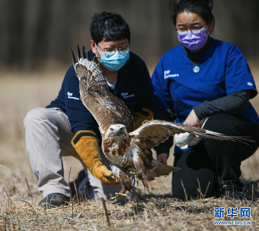 3月20日,北京猛禽救助中心猛禽康復(fù)師戴暢(右)和周蕾放飛大鵟。新華社記者 李京 攝