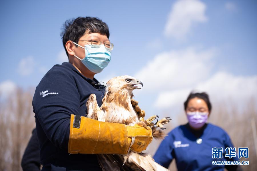 3月20日,北京猛禽救助中心猛禽康復(fù)師周蕾(左)抱著即將被放飛的大鵟。新華社記者 陳鐘昊 攝
