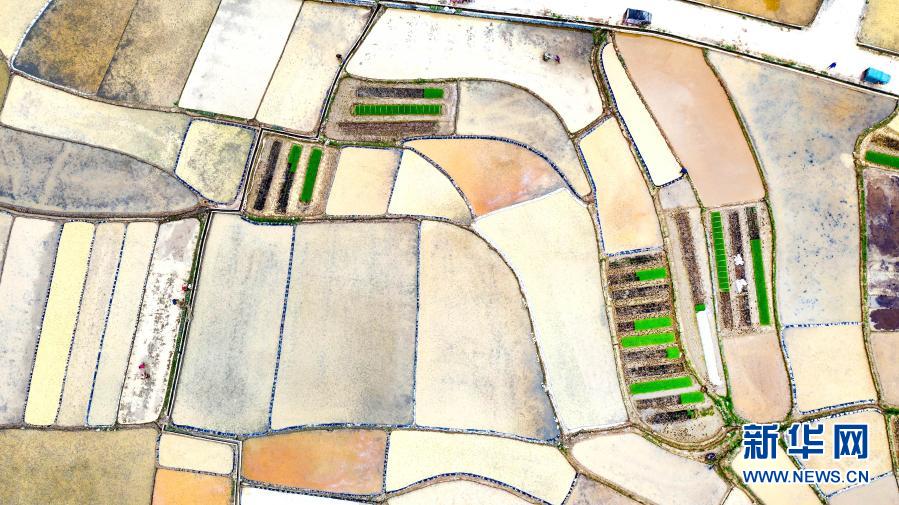 3月24日,廣西河池市東蘭縣武篆鎮(zhèn)色故村農(nóng)民在田間勞作(無(wú)人機(jī)照片)。