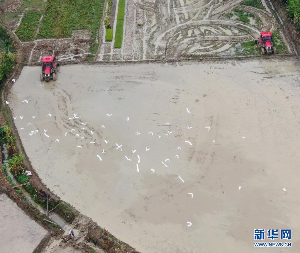 4月5日,云南西雙版納傣族自治州勐??h勐遮鎮(zhèn)曼么勒村的農民駕駛拖拉機耕田(無人機照片) 。