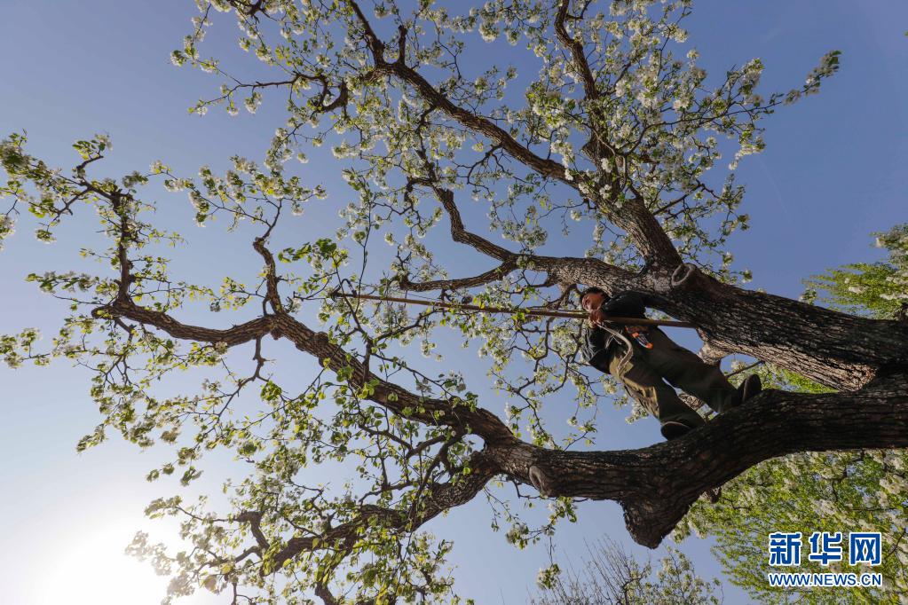 4月6日,河北唐山遵化市鐵廠鎮(zhèn)東平臺村的農民在果園管護梨樹。