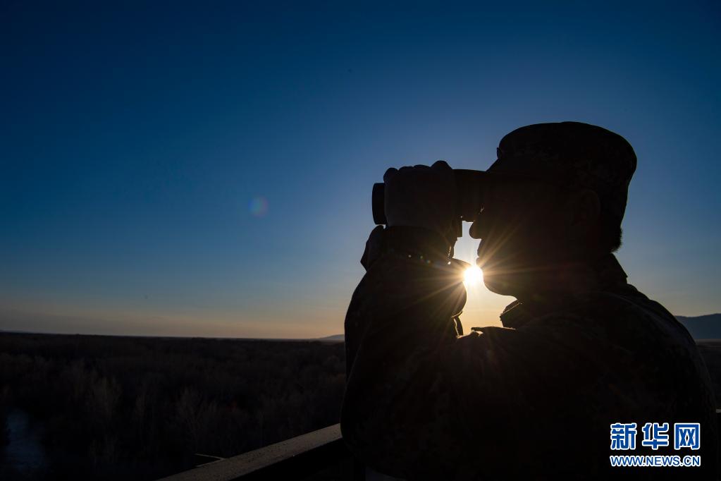 新疆生產建設兵團第10師185團職工馬軍武在瞭望塔上觀察管護轄區(qū)(4月9日攝)。