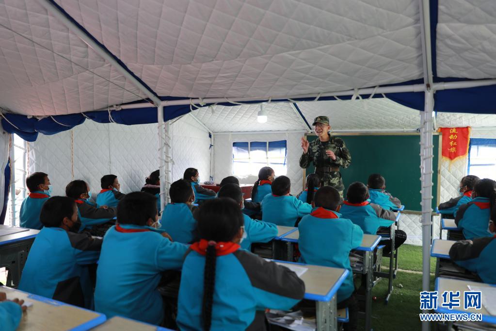 5月24日,武警青??傟牴逯ш牂C動大隊排長張國睿為花石峽鎮(zhèn)藏文中心寄宿制小學(xué)的孩子上課。新華社記者 劉新 攝