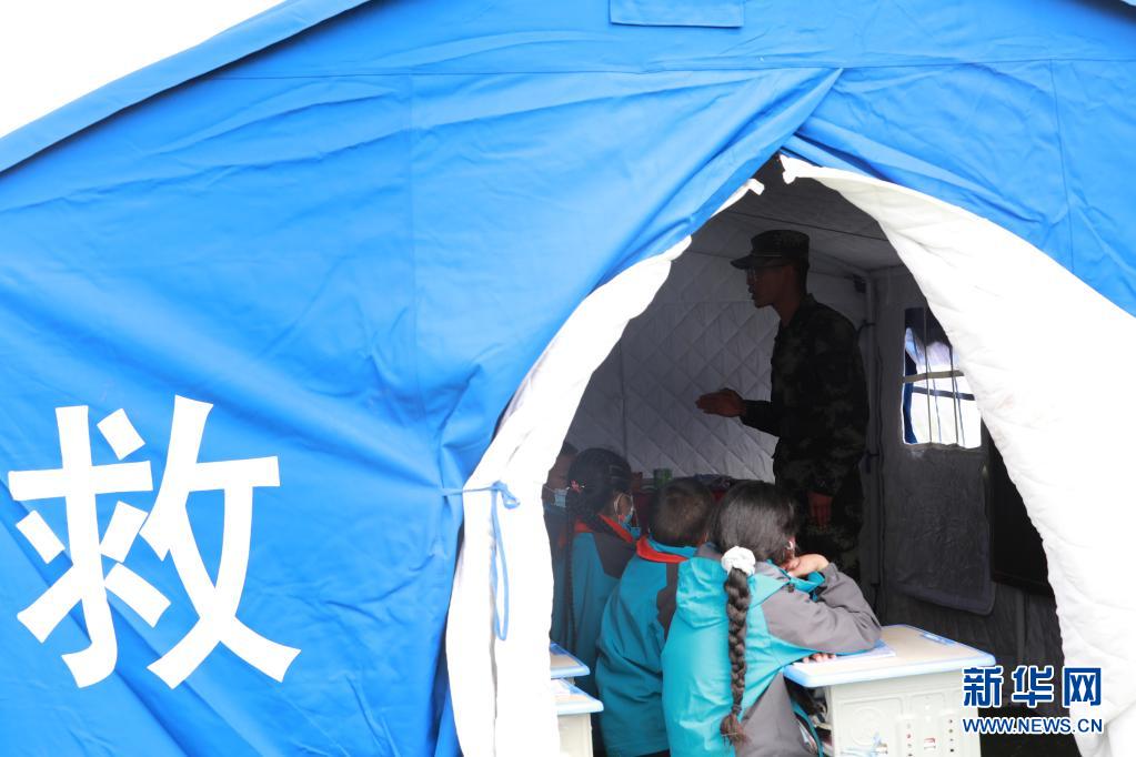 5月24日,武警青??傟?duì)果洛支隊(duì)機(jī)動(dòng)大隊(duì)排長(zhǎng)張國(guó)睿為花石峽鎮(zhèn)藏文中心寄宿制小學(xué)的孩子上課。新華社記者 劉芳 攝