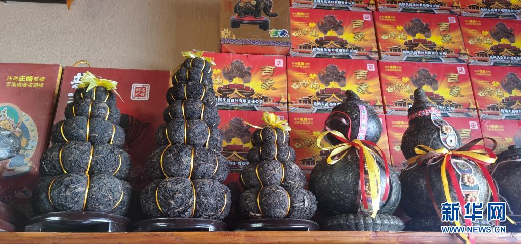 在位于西藏拉薩的一家茶葉公司的門(mén)店內(nèi)擺放著造型獨(dú)特的茶葉制品(4月23日攝)。新華社記者 張京品 攝