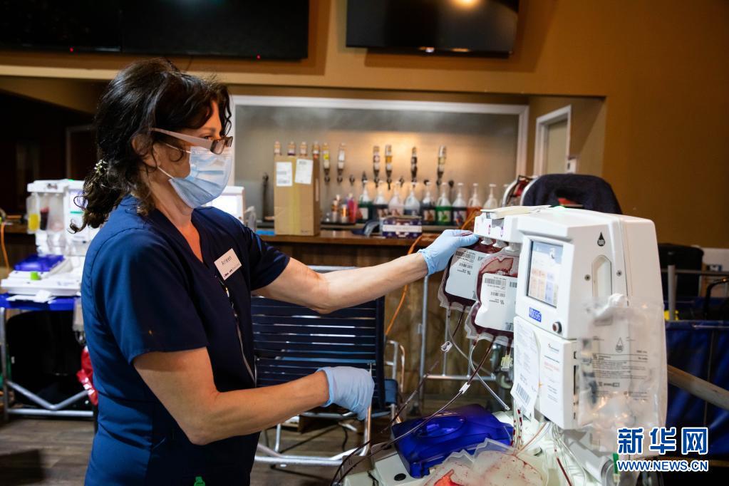 6月14日,在美國紐約州長島地區(qū)的貝肖爾,工作人員在美國紐約血液中心舉行的獻(xiàn)血活動(dòng)上處理采集的血液。