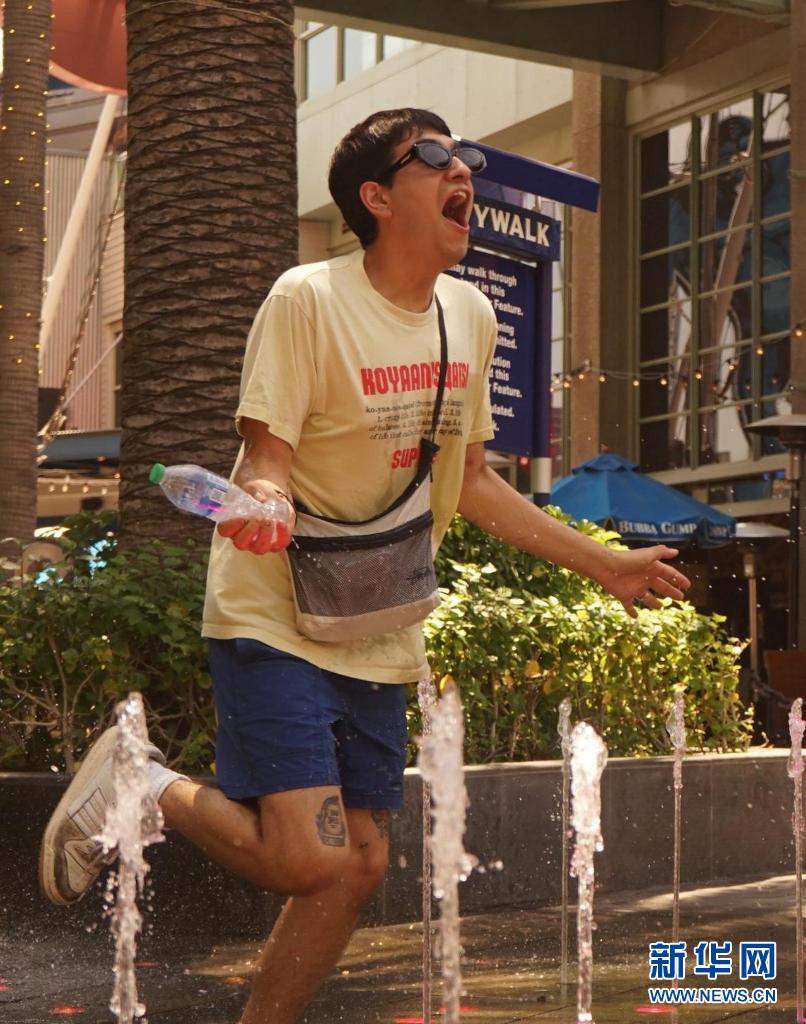 6月16日,美國(guó)加利福尼亞州洛杉磯市民在噴泉旁戲水納涼。加州南部本周迎來(lái)今年的首次高溫天氣。