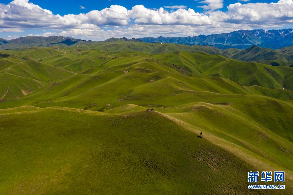 新疆裕民縣的牧民策馬奔馳在巴爾魯克山區(qū)夏牧場(chǎng)上(6月15日攝,無人機(jī)照片)。