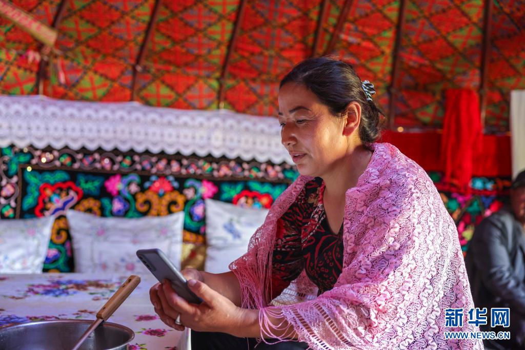 在新疆裕民縣巴爾魯克山區(qū)夏牧場上,一名開辦牧家樂的牧民在氈房內(nèi)用手機(jī)上網(wǎng)(6月16日攝)。