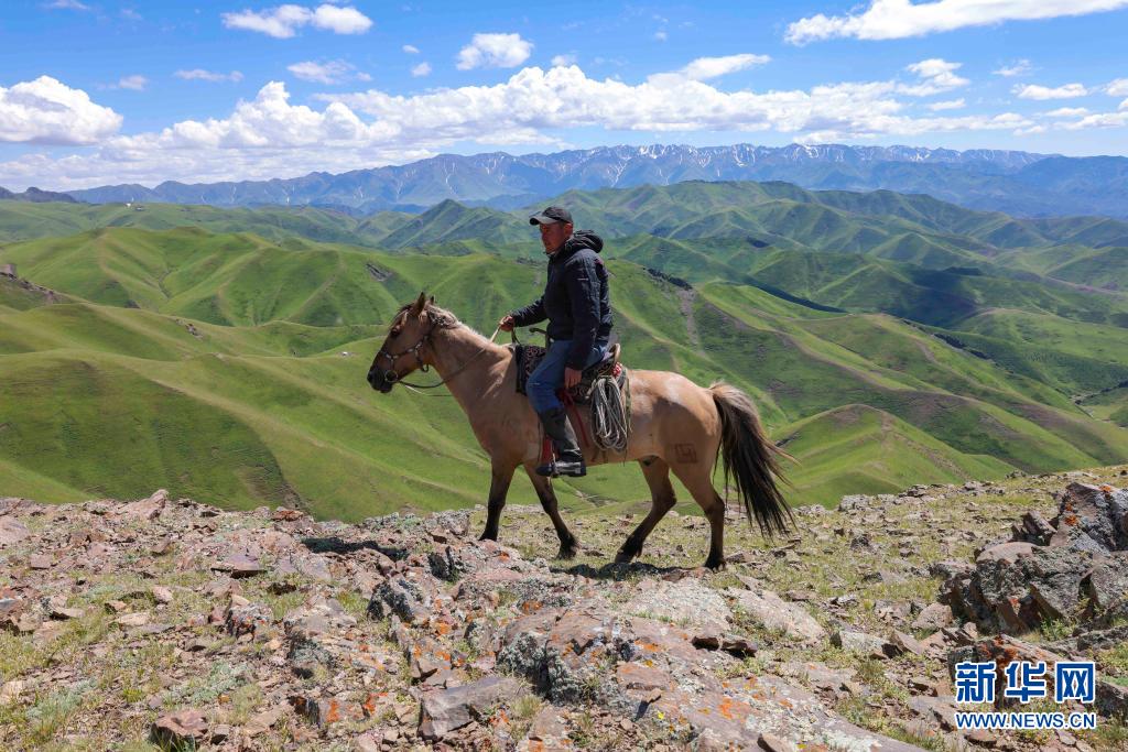 新疆裕民縣的牧民騎馬行進(jìn)在巴爾魯克山區(qū)夏牧場(chǎng)上(6月15日攝)。