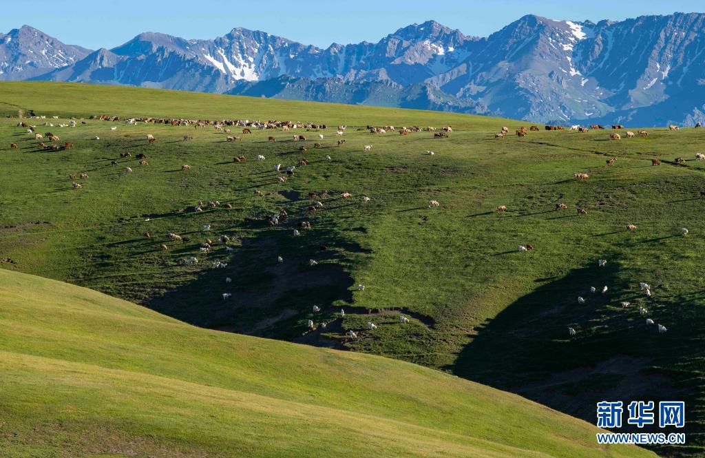 眼下,巴爾魯克山區(qū)的夏牧場迎來放牧黃金季。群山起伏,峰巒翠綠,氈房、牛羊等牲畜分散點綴其間,自駕游客時而穿梭往來,共同譜寫一曲高山夏季牧歌。