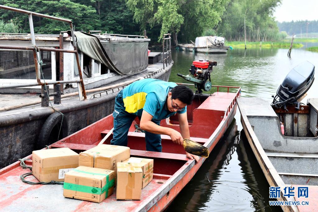 6月20日,在微山縣南陽(yáng)鎮(zhèn),郵遞員王少朋在清理郵船上的積水。