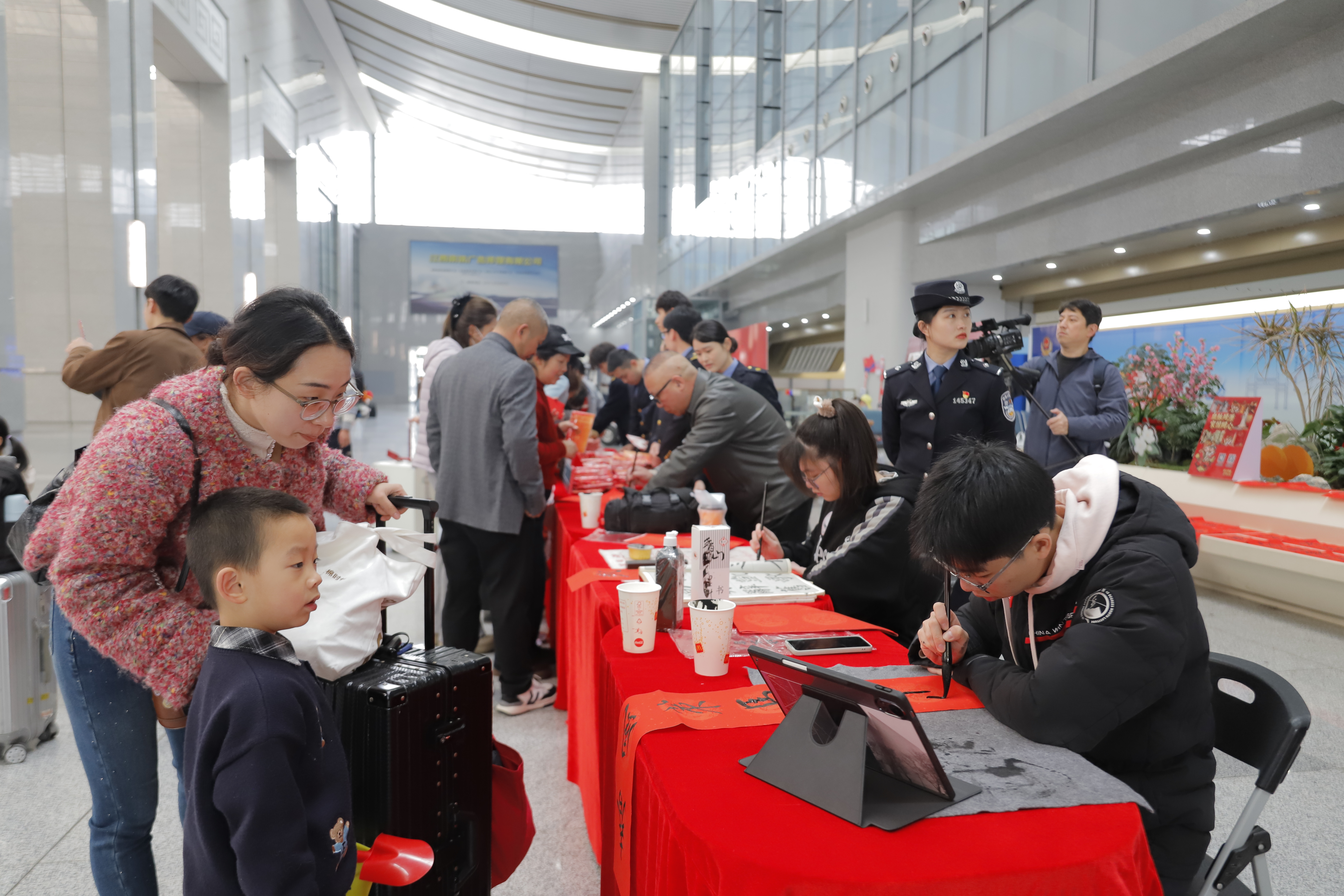 “这副春联寓意真好!我要了!”活动现场还邀请书法家挥毫泼墨,围绕马年生肖与“姓”福主题创作春联与福字,并根据旅客需求免费定制、赠送。“‘日日财源顺意来,年年福禄随春到’,这副对联是我女儿刚写的,真好看!”来自东北的李女士兴奋地说道。