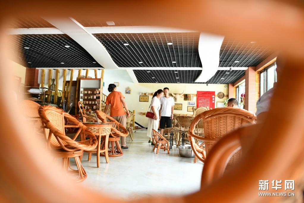 7月10日,在遵義市匯川區(qū)板橋鎮(zhèn)婁山關社區(qū),游客在一家藤編產品專賣店選購產品。藤編技藝是遵義市級非物質文化遺產。近年來,貴州省遵義市匯川區(qū)板橋鎮(zhèn)采取“支部+產業(yè)+農戶+旅游”的生產經營模式,建立非遺工坊,成立藤編產業(yè)協會,開展技能培訓,開設旅游商品門面,不斷發(fā)展壯大藤編產業(yè),助力群眾增收。新華社發(fā)(羅星漢 攝)