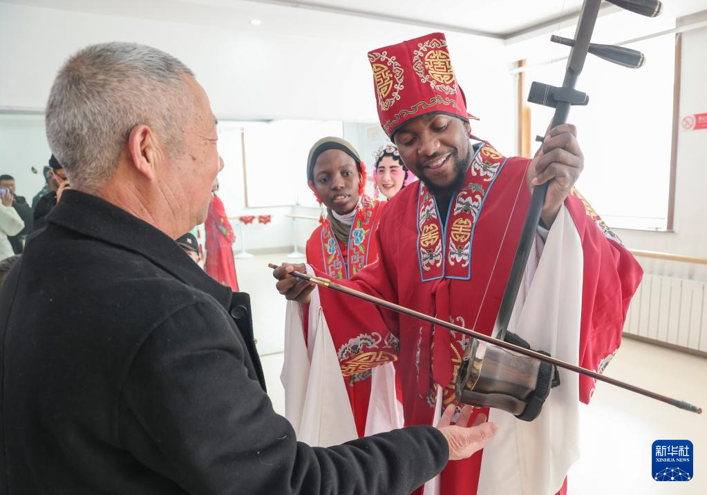 2月17日,在山东省临沂市兰山区枣园镇弦子戏非遗展厅,外国留学生在民间艺人的指导下体验二胡演奏。