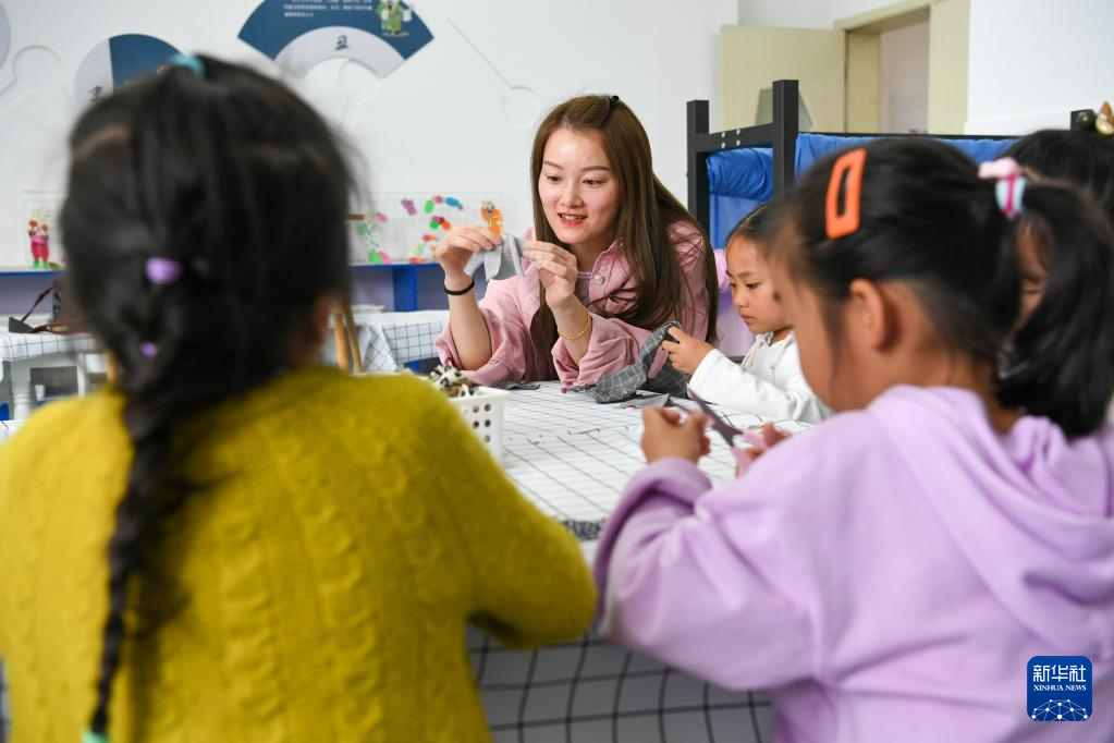 4月20日,小朋友们在给木偶玩具制做服饰。