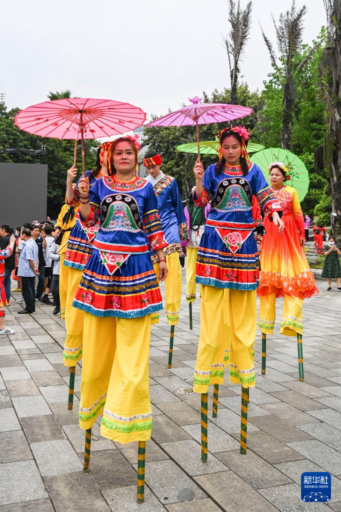 4月22日,在中国—东盟(南宁)非物质文化遗产周开幕现场,演员在表演踩高跷。
