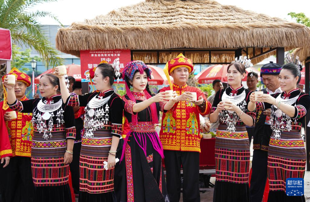 4月23日,在海南省乐东黎族自治县,黎族同胞共饮山兰酒庆祝“三月三”。