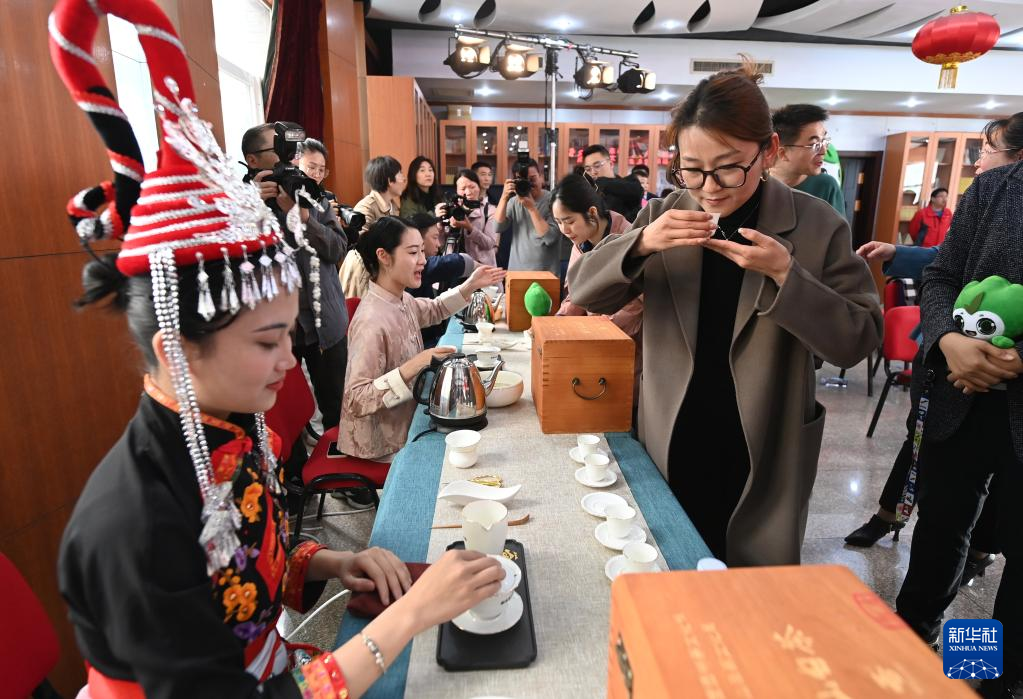 4月25日,媒体记者、与会嘉宾在茶文化节新闻发布会后品尝、了解高山白茶。