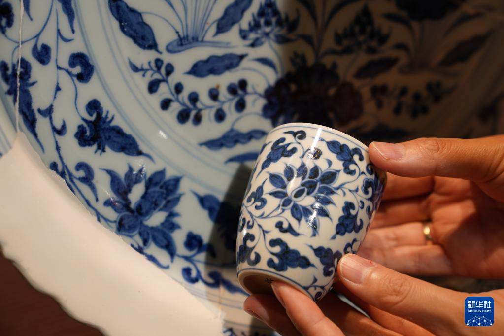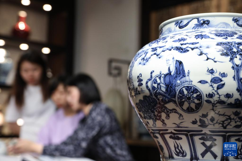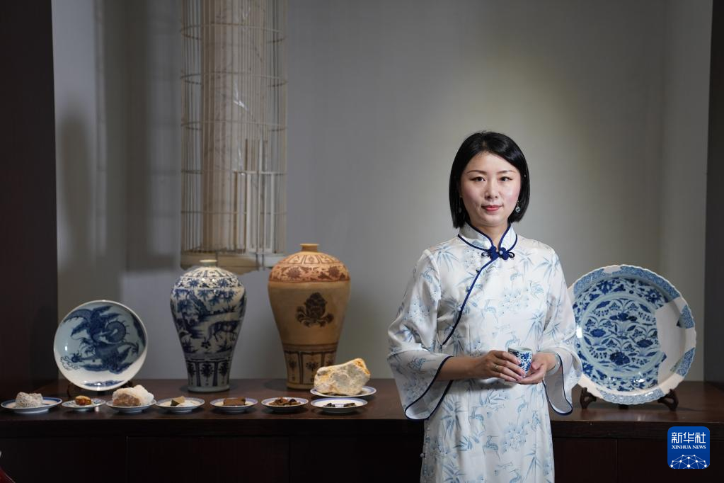 4月19日,在江西景德镇御窑博物馆,蔡文娟观看青花相关的展览。