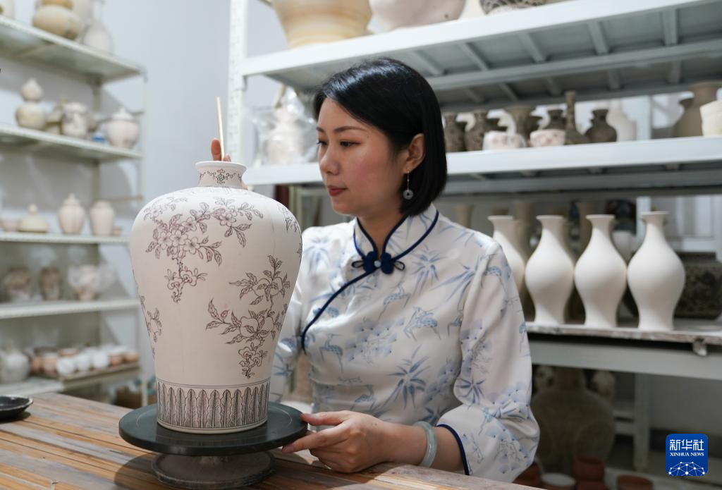 4月19日,在江西景德镇,蔡文娟在“青花故事”创作基地创作。