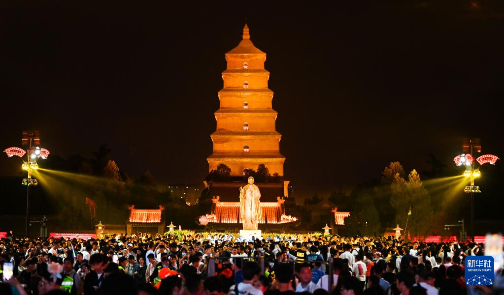 5月1日,游客在西安大唐不夜城步行街游览。新华社发(邹竞一 摄)