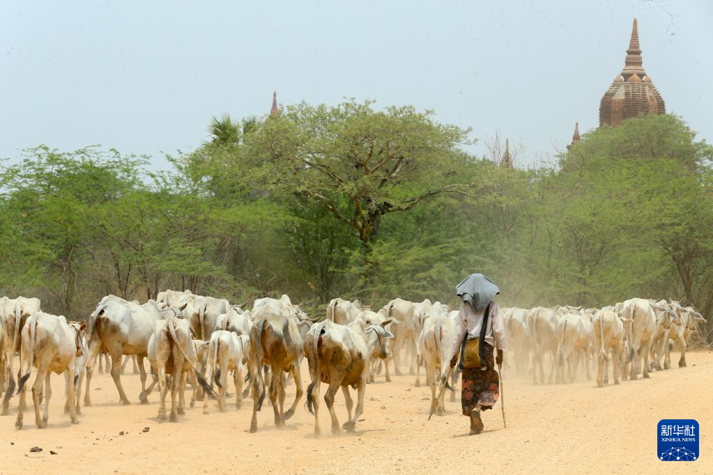5月4日,一名女子在缅甸蒲甘古城驱赶牛群。