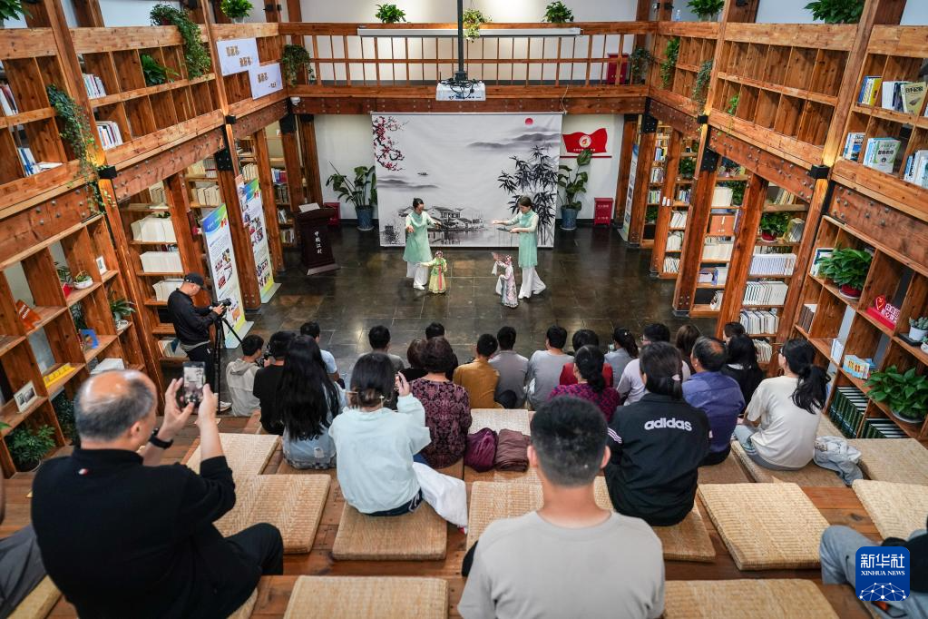 孙菁(前左)和施锦芳在七都镇江村文化礼堂表演昆曲木偶(5月17日摄)。
