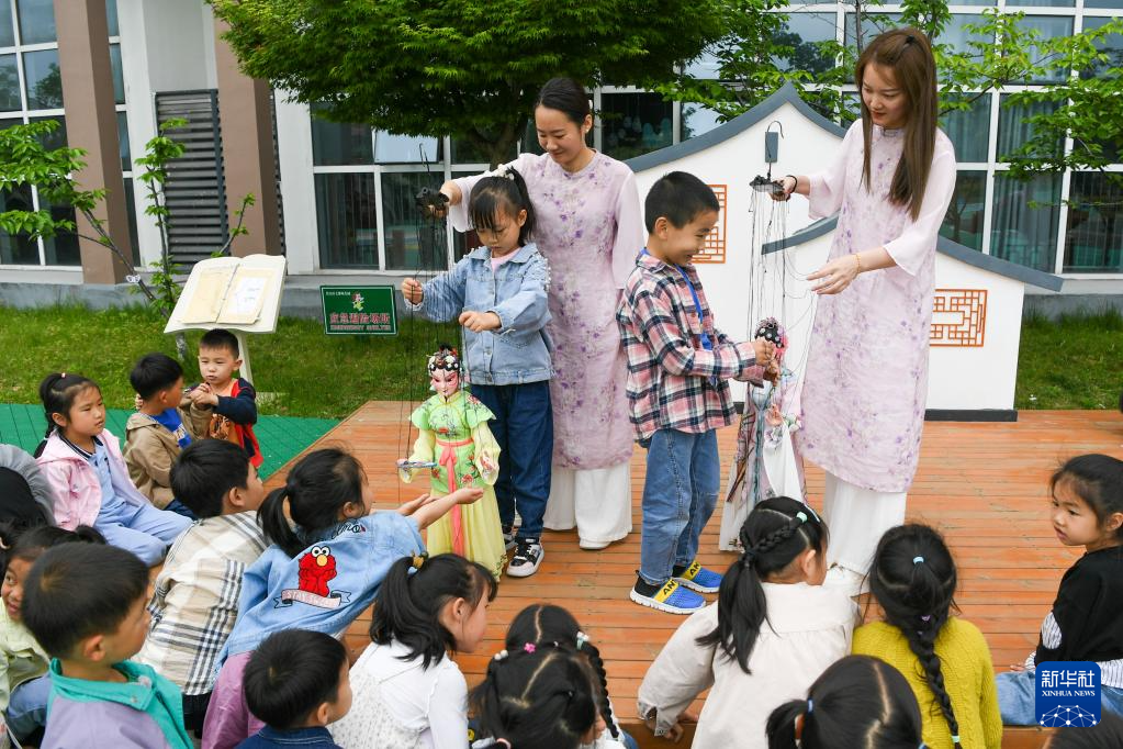 孙菁(左)和施锦芳在七都幼儿园教小朋友们控制提线木偶(4月20日摄)。