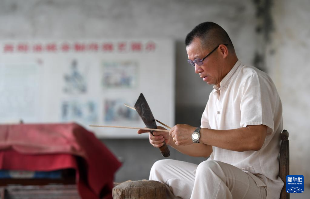 6月1日,在广西宾阳县宾州镇陆村,陆云岗在剖竹篾准备制作油纸伞。