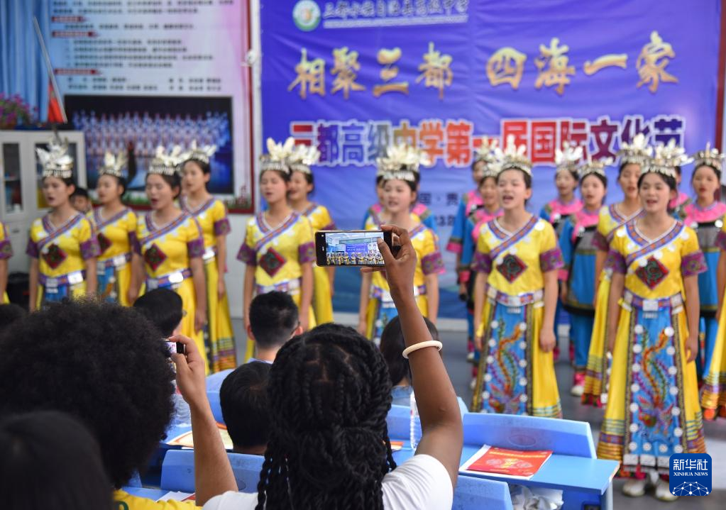 6月5日,来华留学生观看三都高级中学学生演唱的水族语言歌曲《水歌》。