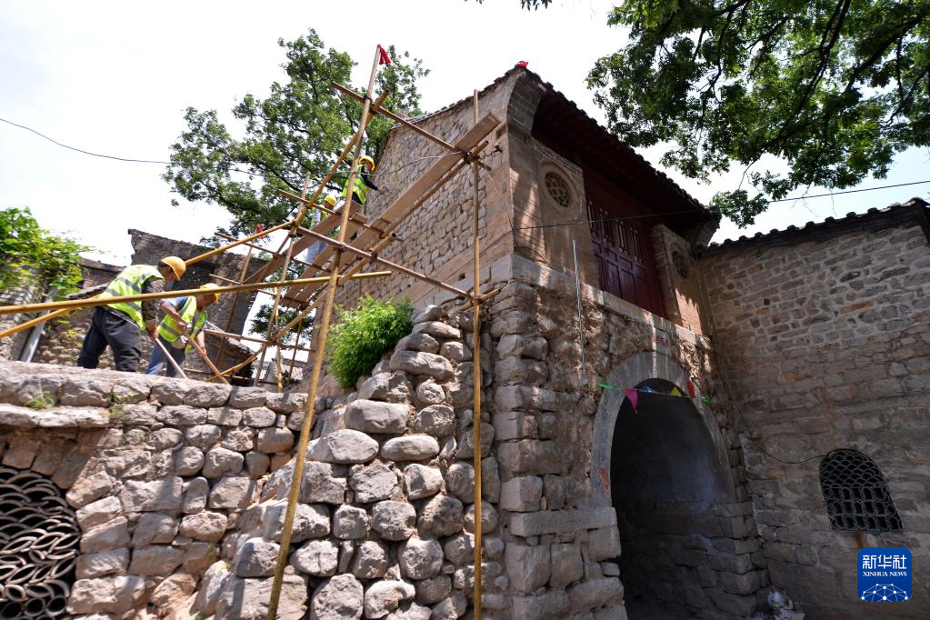 6月7日,施工人员在河北省石家庄市井陉县小梁江村进行民居修缮。