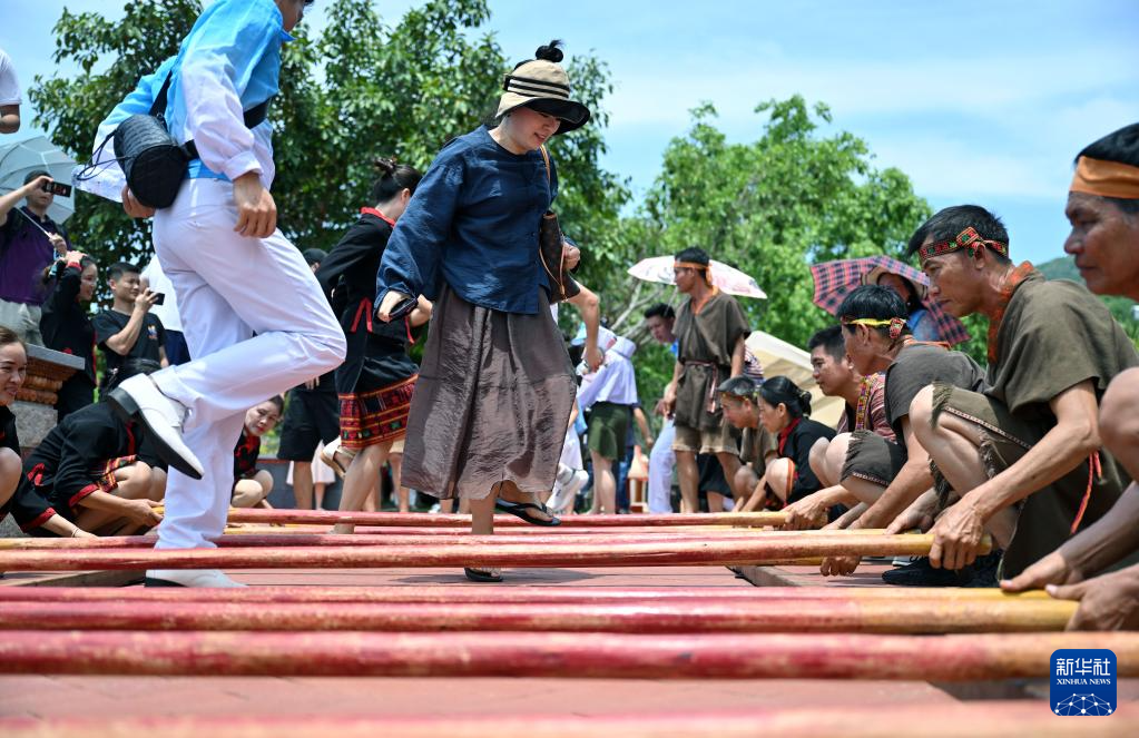 6月10日,2023年“文化和自然遗产日”海南省宣传展示暨第三届三亚南山非遗节在三亚市南山文化旅游区举行,游客在体验黎族打柴舞。