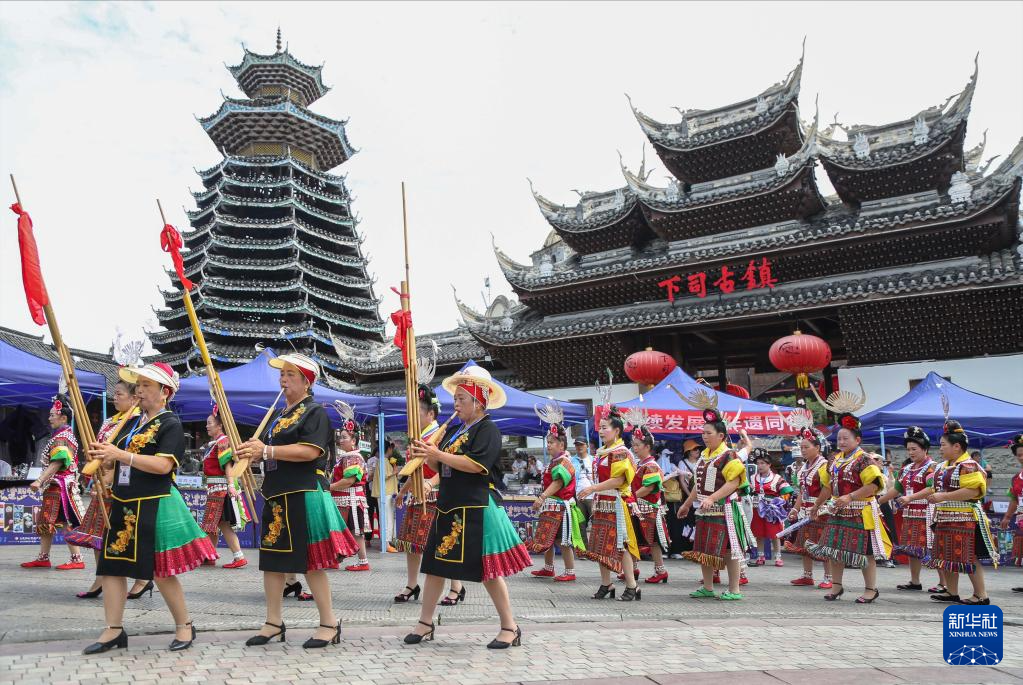 6月10日,贵州省黔东南苗族侗族自治州凯里市下司古镇举办“文化和自然遗产日暨非遗购物节”,当地群众在活动现场展示芦笙舞。