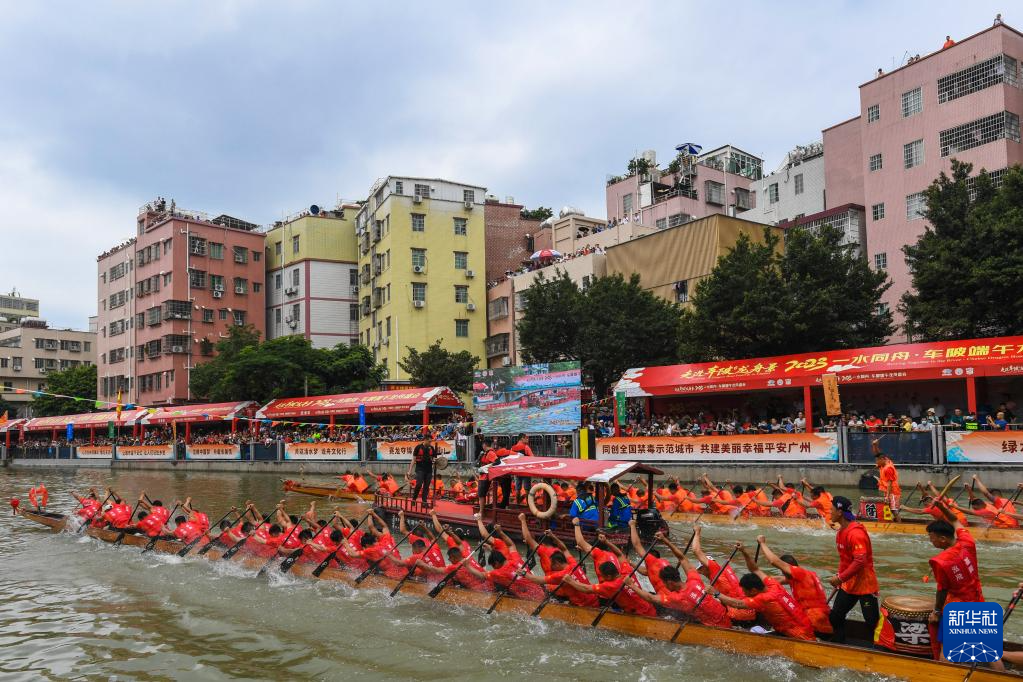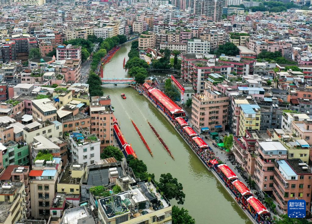 自农历四月初八“起龙舟”开始,广州地区就开启了划龙舟、迎端午的年度大戏。6月15日,车陂村12条龙船在车陂涌进行龙舟竞渡。