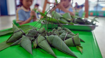 6月21日,在重庆市永川区板桥镇板桥老街,村民展示制作好的粽子。