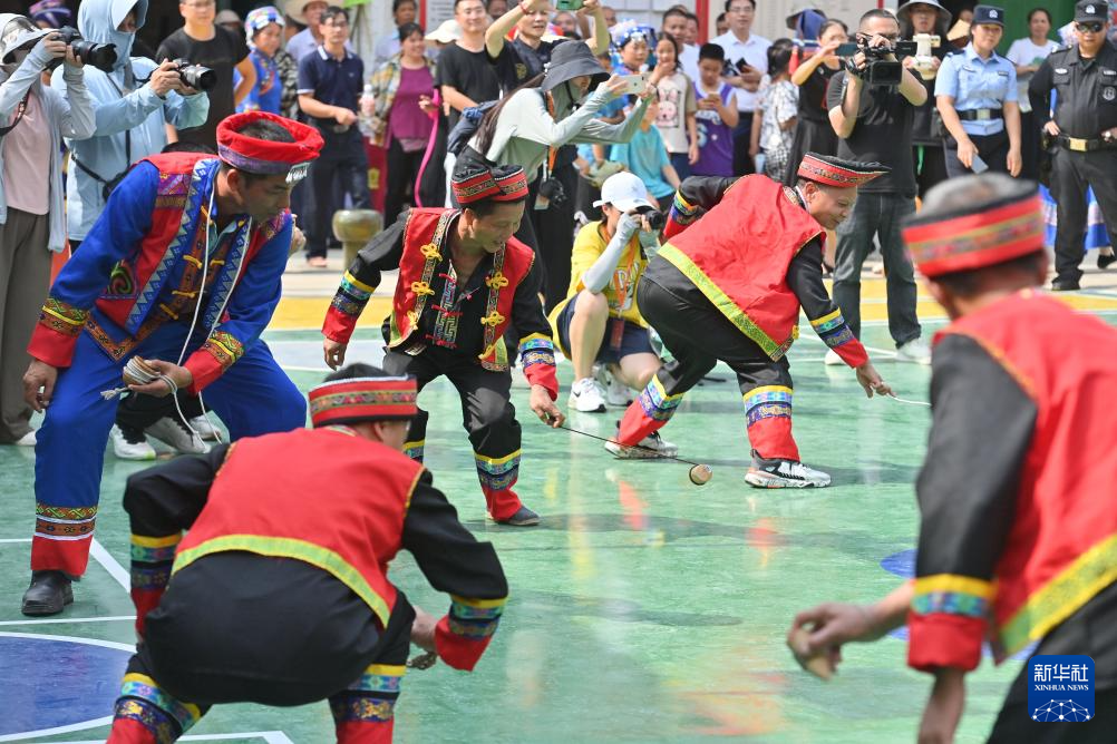 7月11日,在大化瑶族自治县仁良村,村民在陀螺文化展演活动中打陀螺。