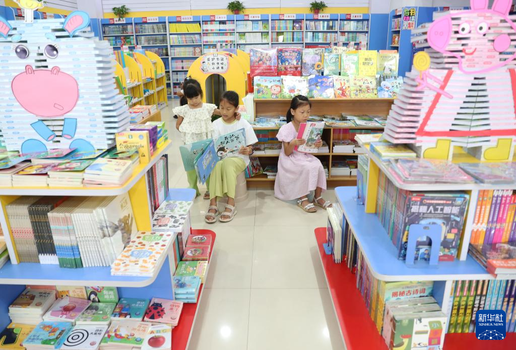 8月1日,在湖南省衡阳市衡东县新华书店,几名小朋友在阅读。