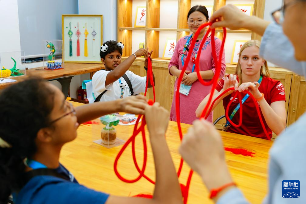7月31日,在成都大运村,斯里兰卡运动员哈西妮学习制作中国结。