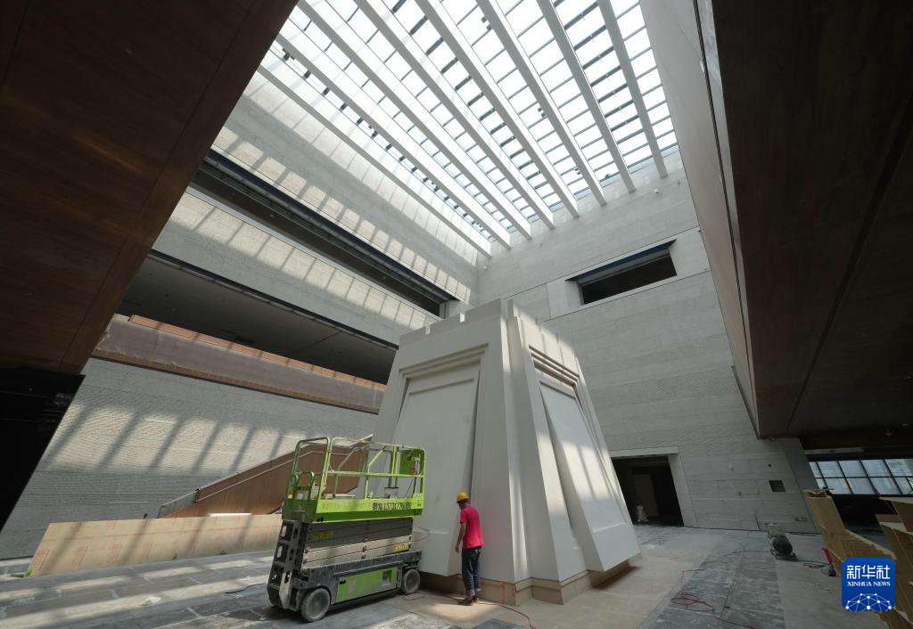 8月4日,工人在山海关中国长城博物馆进行内部装修施工。