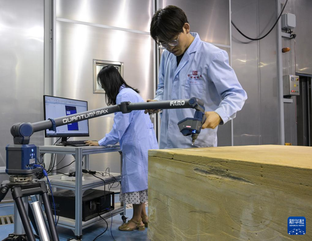 在敦煌研究院多场耦合实验室中,工作人员对庆阳北石窟寺砂岩样品进行三维扫描分析(8月3日摄)。