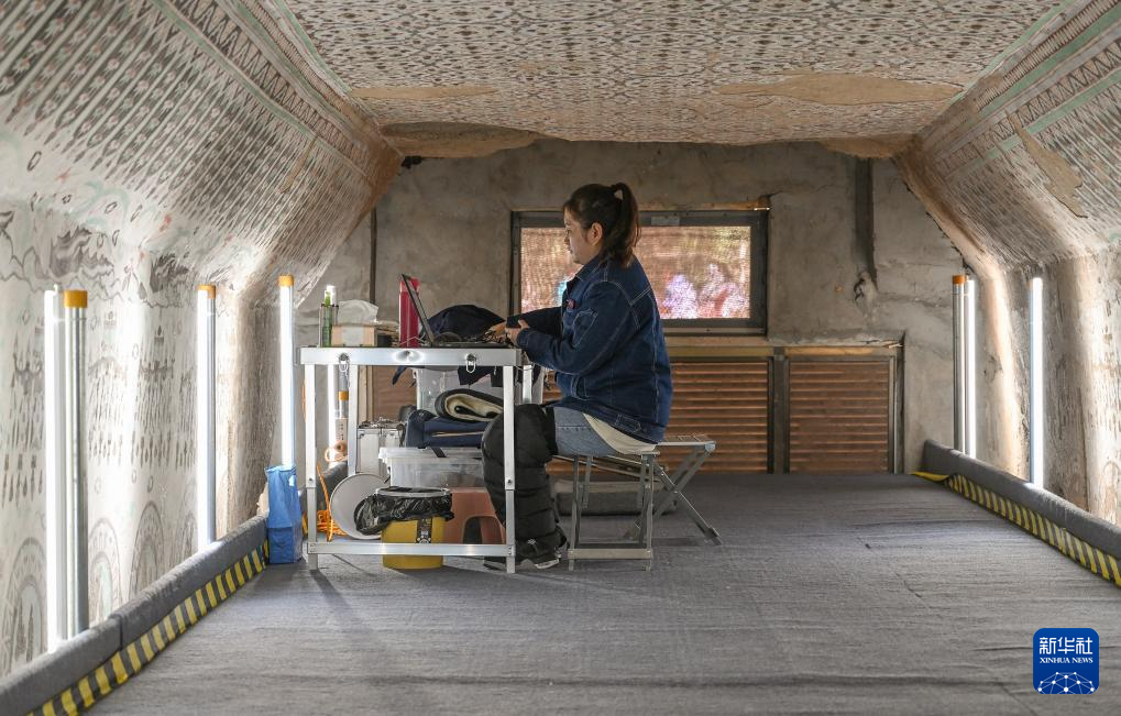在敦煌莫高窟正在保护修缮的第55窟内,一位文保工作者对采集的数据进行整理(8月3日摄)。