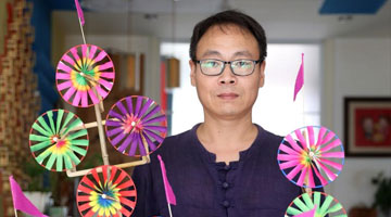 8月17日,崔凯在辽宁省营口市自己家中展示他制作的吉祥轮彩纸风车成品。