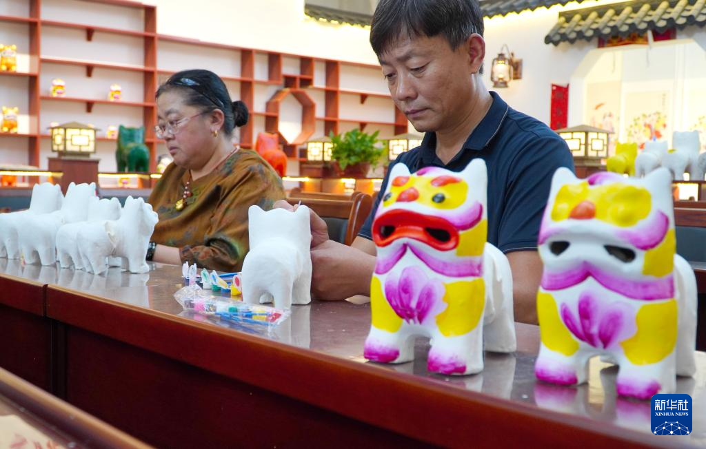 9月5日,在山东省高密市姜庄镇的一处非遗工坊,非遗代表性传承人聂宏希(右)在制作泥老虎产品。