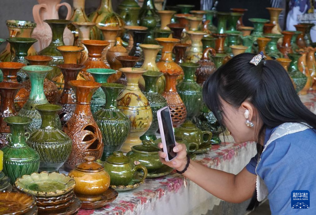 9月5日,参观者在英吉沙县芒辛镇恰克日库依村拍摄土陶制品。