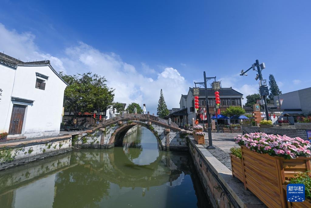 9月6日,游客在游览湖州市吴兴区织里镇义皋古村落。