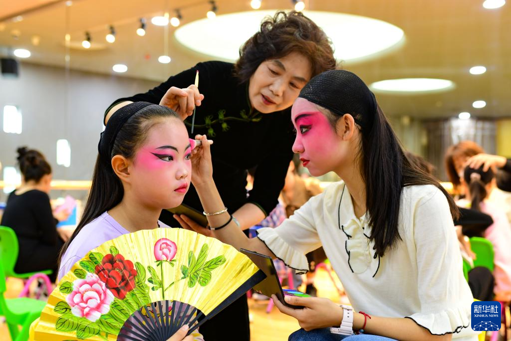 9月9日,巴什区青少年发展中心京剧团教师李素文指导小演员。